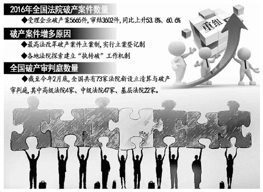 破产案件正越来越多地进入法院。据统计,2016年,全国法院受理企业破产案5665件、审结3602件,同比2015年分别上升53.8%、60.6%。
